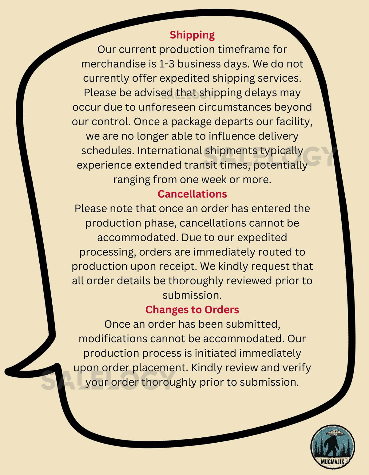 Order Queue and Production: Your purchase will go into our waiting queue for two hours after payment before it is printed. You have this window of time to amend the order’s information or cancel it. It usually takes 1-3 business days for production.