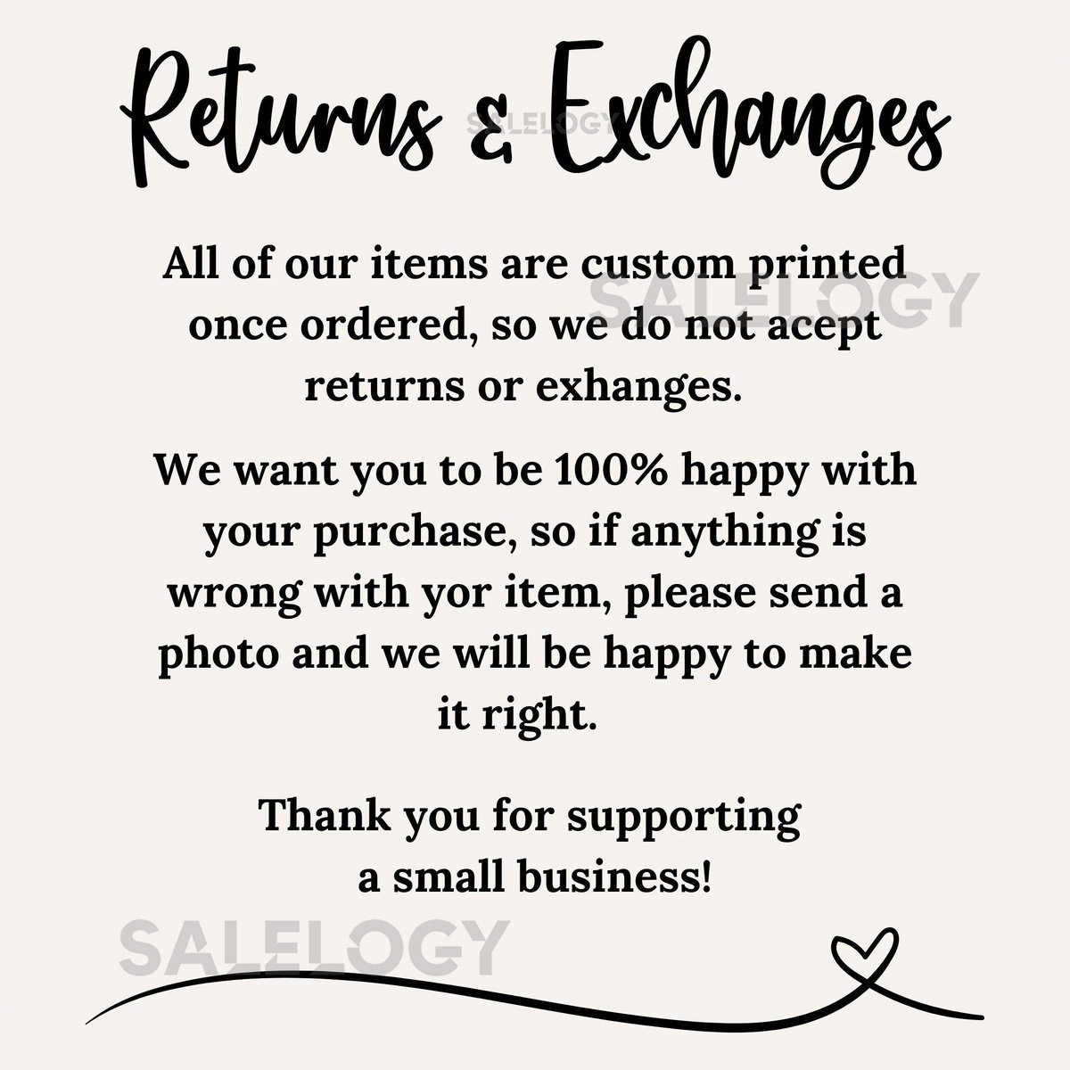 We make every effort to guarantee that each order is produced precisely and to a high standard. However, because our products are produced to order, errors could occasionally happen. We accept returns and exchanges in the circumstances listed below.