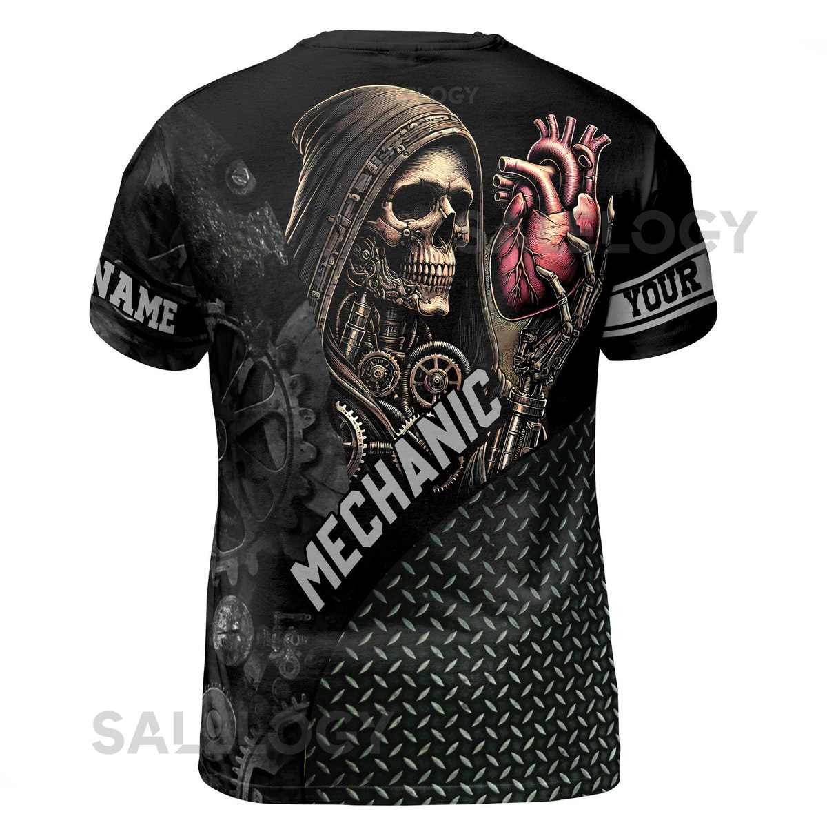 Customize Name Mechanic Mechanical Grim Reaper Holding Heart Metal Pattern Black 3D T-Shirt S-5XL_146