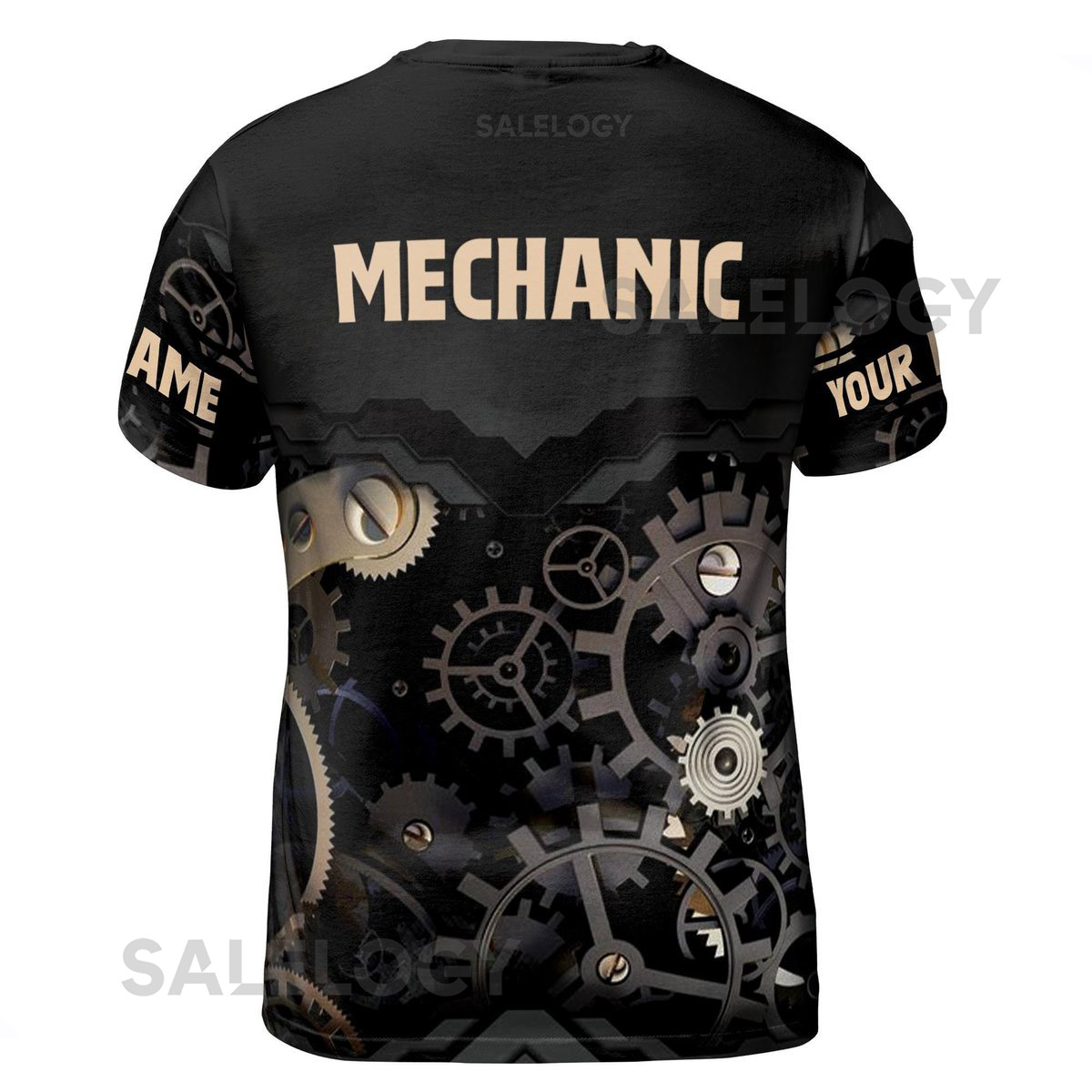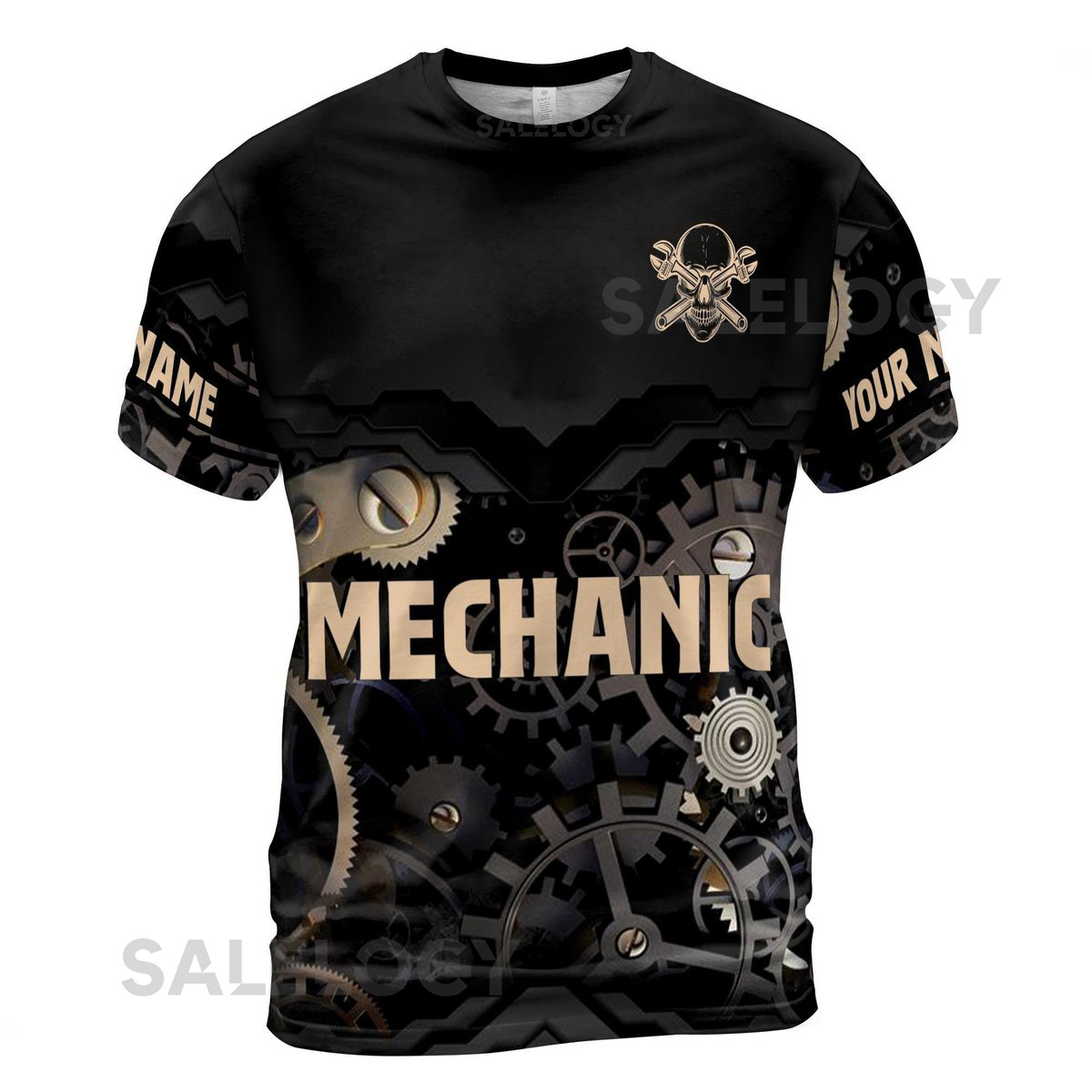 Customize Name Mechanic Wrench Skull And Gears Black Beige 3D T-Shirt S-5XL_151