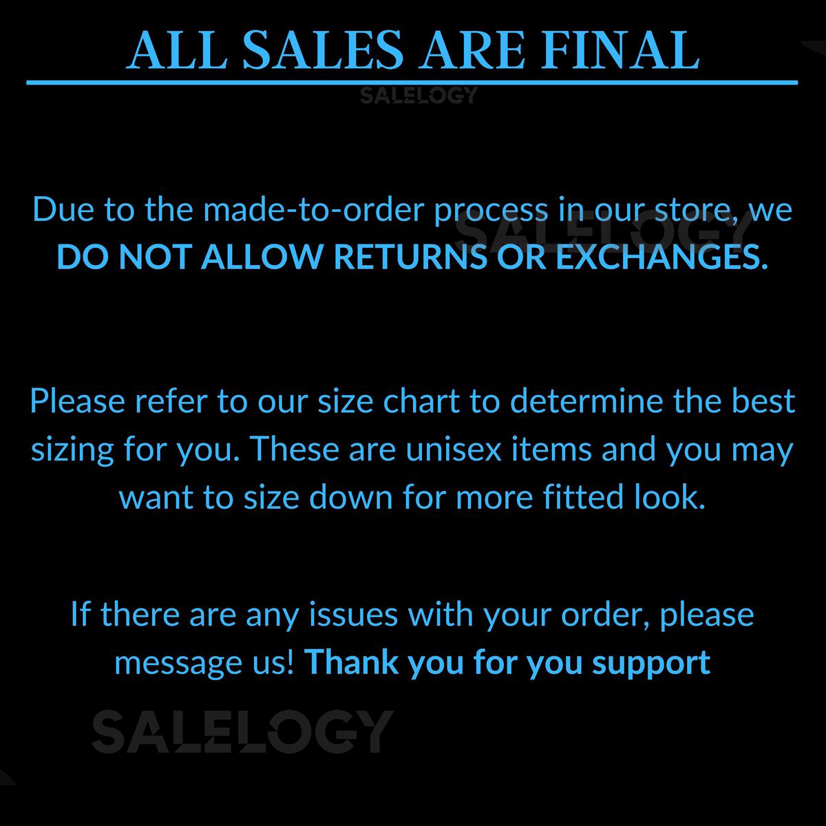 We make every effort to guarantee that each order is produced precisely and to a high standard. However, because our products are produced to order, errors could occasionally happen. We accept returns and exchanges in the circumstances listed below.