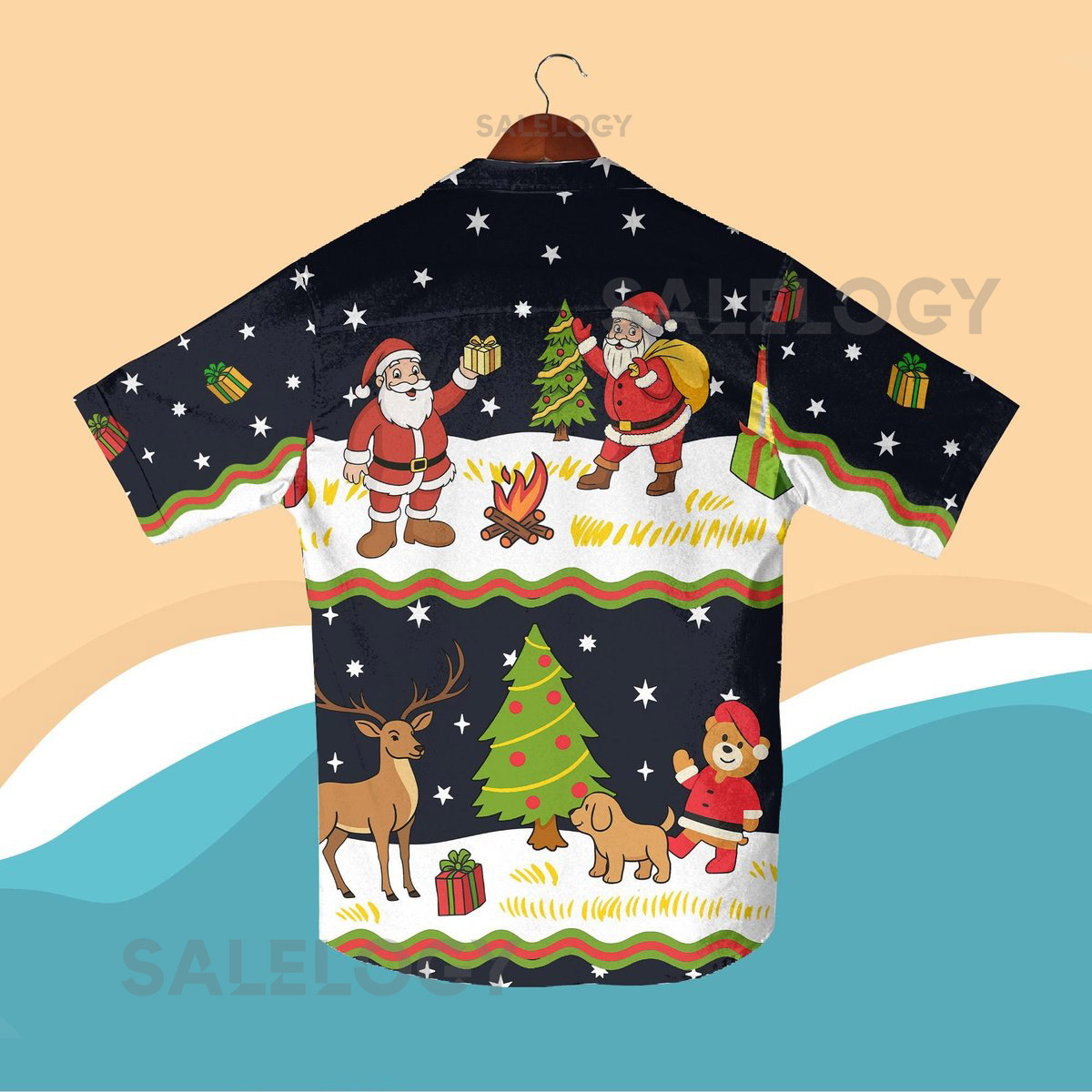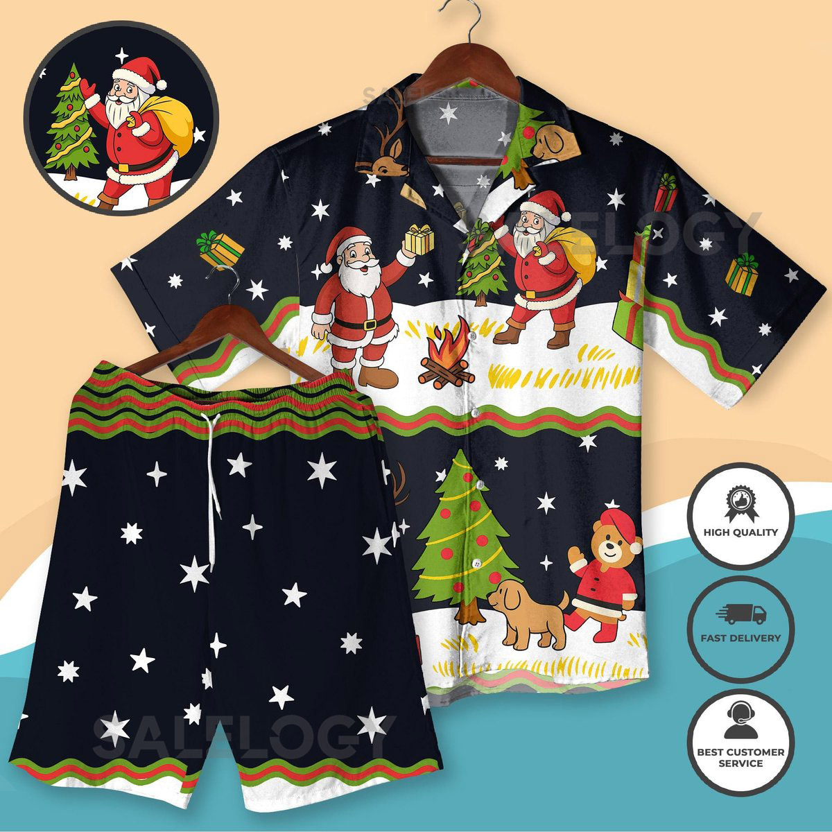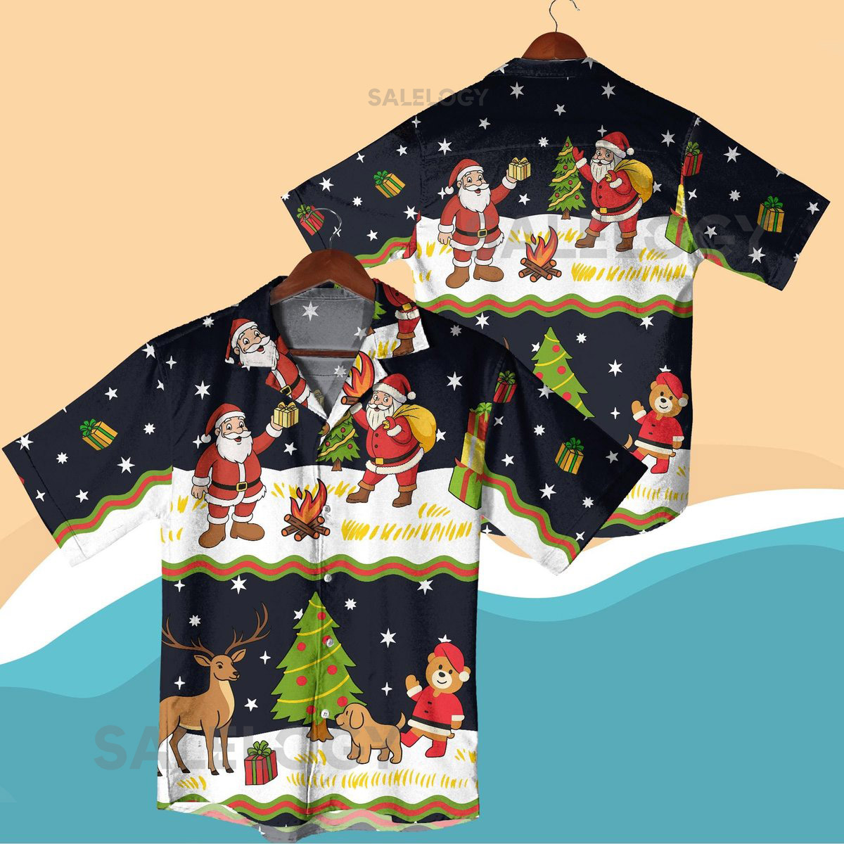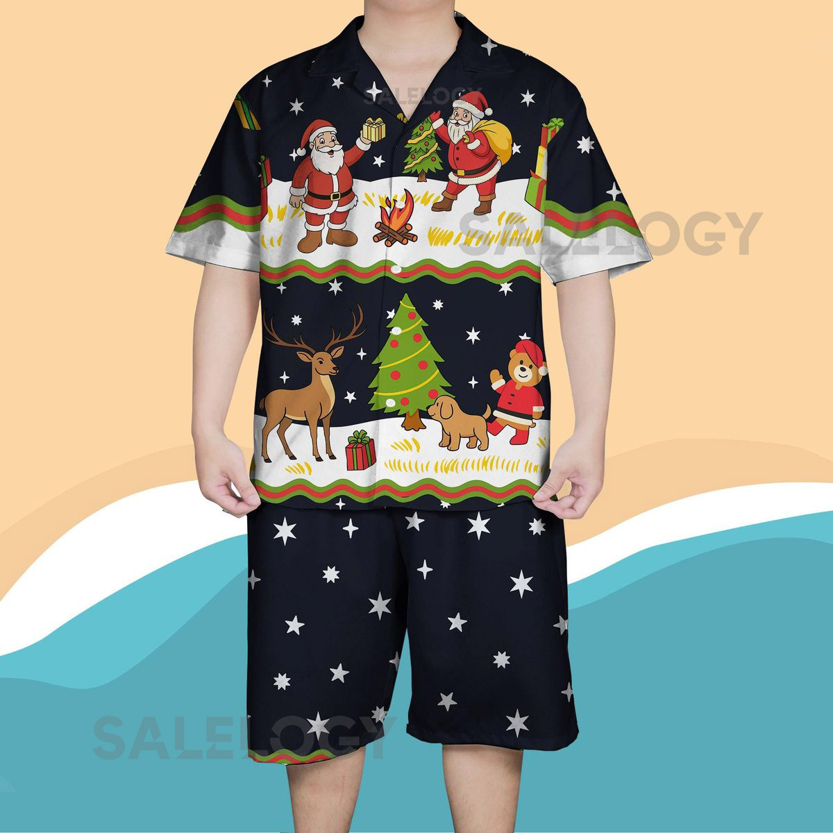 Santa Claus Christmas Hawaiian Shirt Funny Holiday Vacation Outfit Xmas Reindeer Tree Print Beach Shirt and Shorts Christmas Party Gift_224