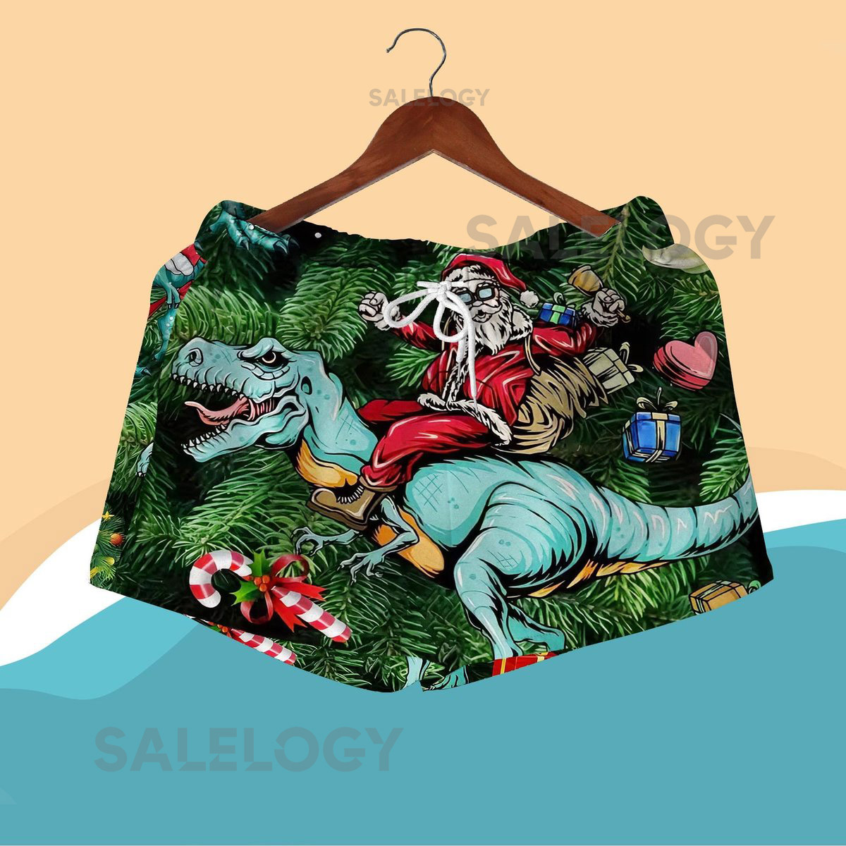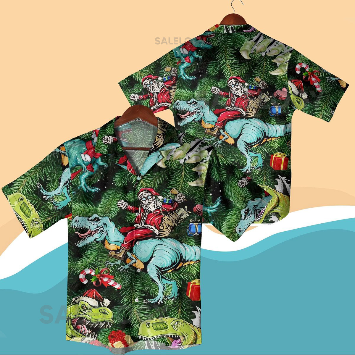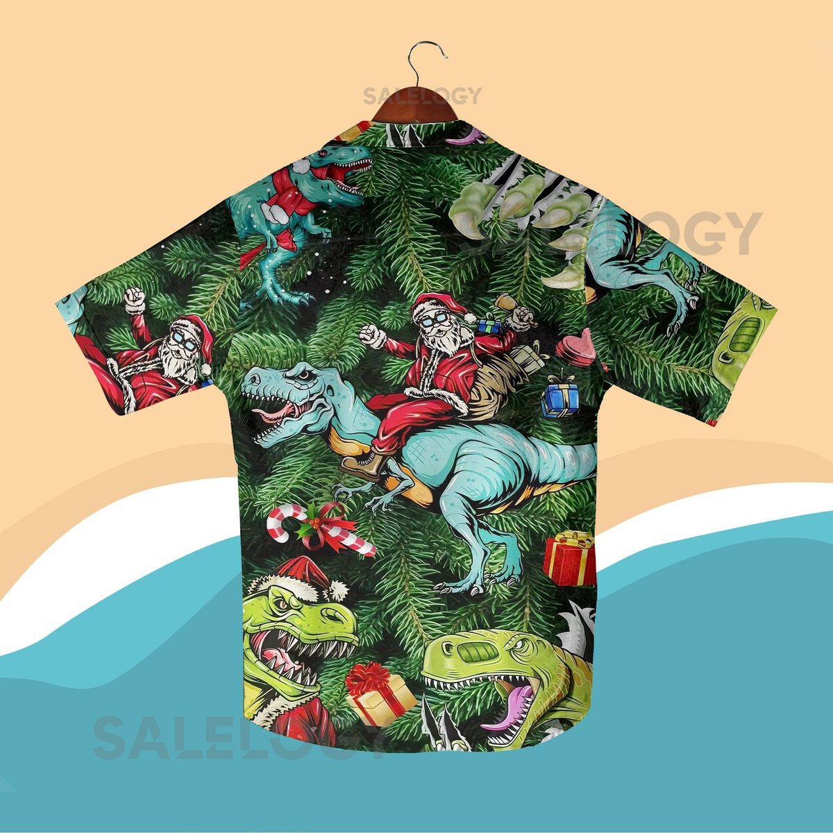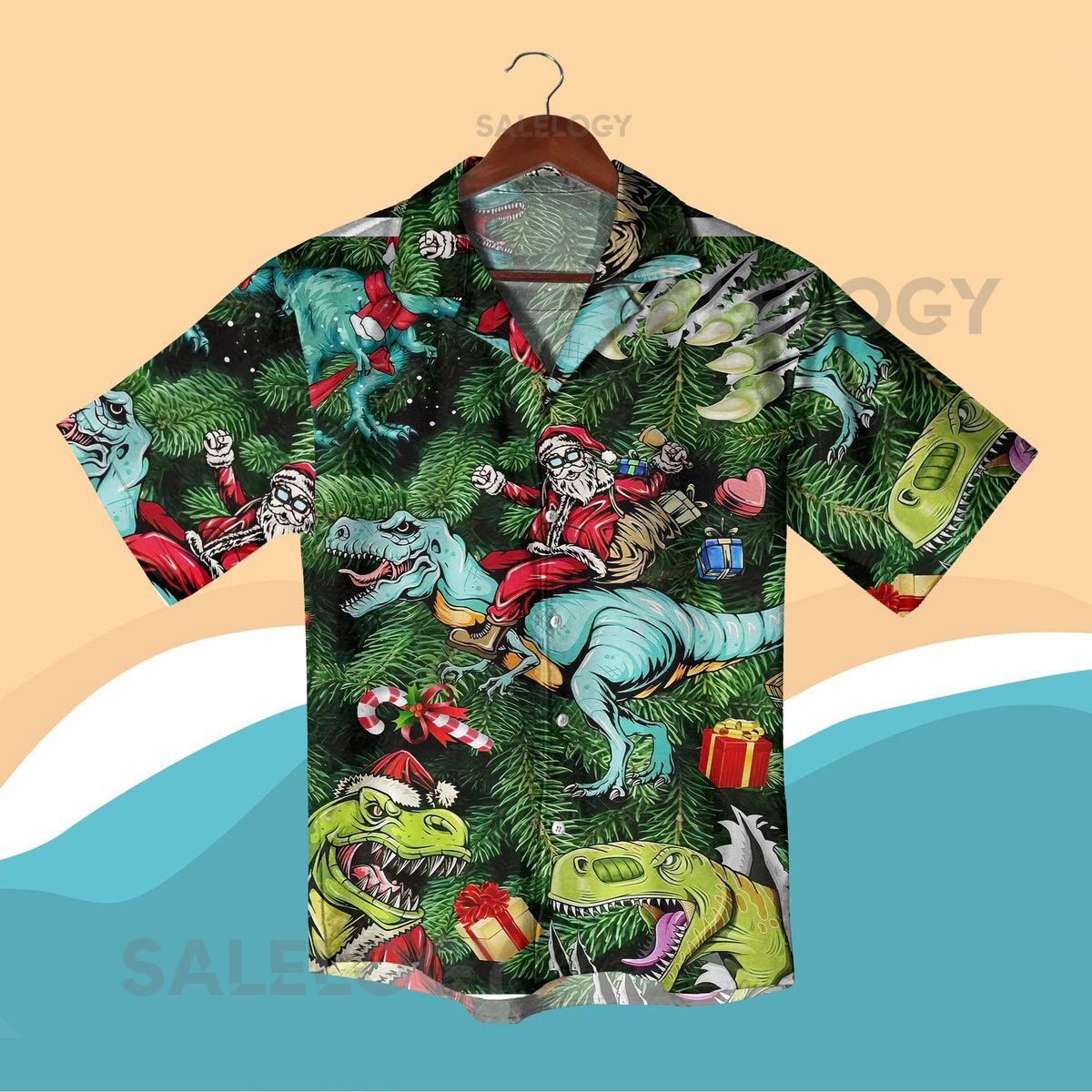 Santa Riding Dinosaur Christmas Hawaiian Shirt Set Funny Xmas Aloha Shirt and Shorts Festive Holiday Party Outfit Santa Hawaiian Shirts_232