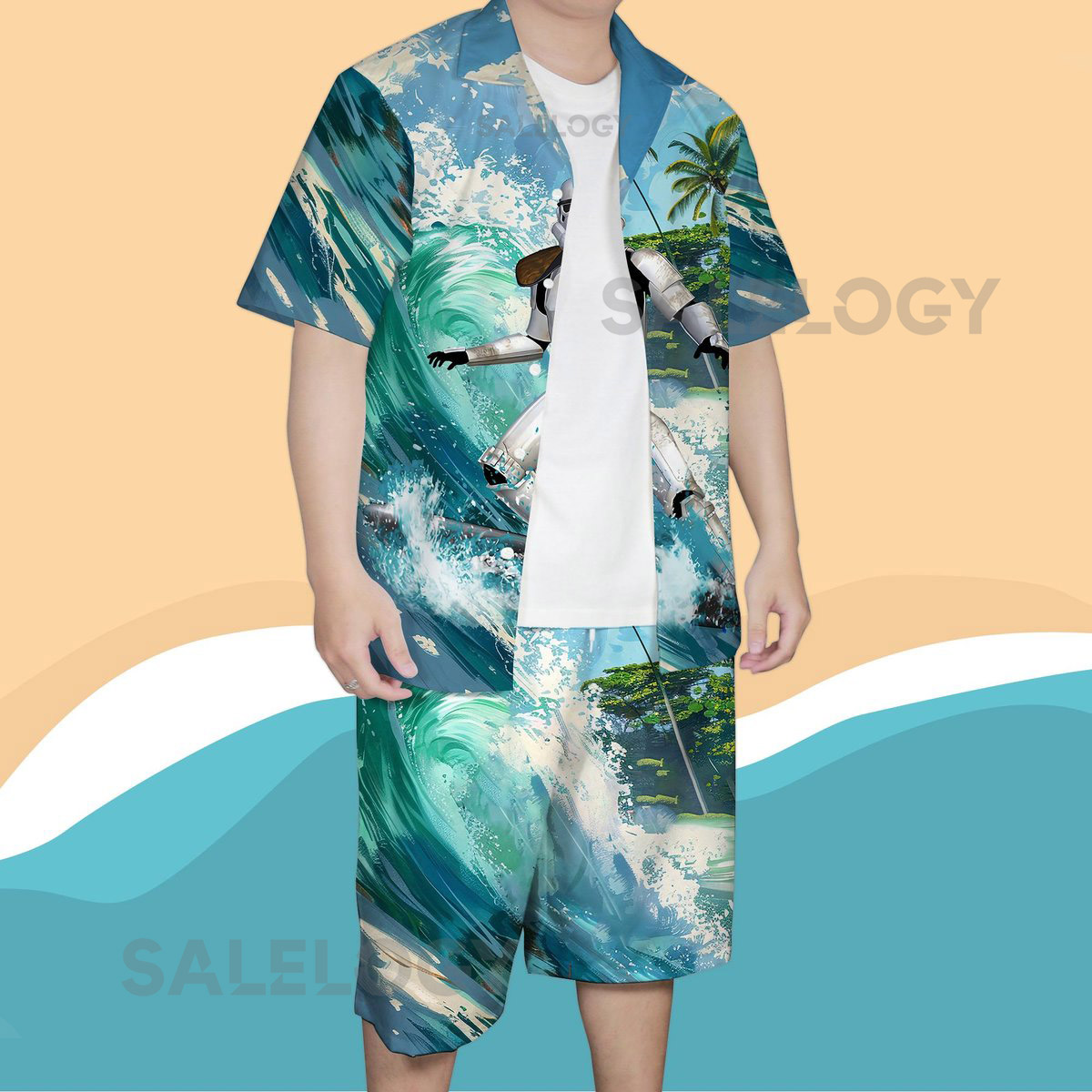 Futuristic Surfing Soldier Hawaiian Shirt Funny Sci-Fi Beach Outfit Tropical...